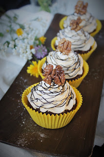 Hyi kauhistus, kuinka pitkä aika viime päivityksestä on vierähtänyt!!!! Kesä on kylläkin ollut tosi kiireinen, joten siksi olenkin joutunut vähän pitämään "kesälomaa" blogista! Leiponut olen kuitenkin ahkerasti, ja nyt onkin aika alkaa laittelemaan kesän leipomuksista reseptejä ja kuvia..Nämä cupcaket saivat alkunsa, kun törmäsin kaupassa banaanipyreeseen. Tuo makeuttamaton sose oli kiva löytö, sillä se ei tummene, eikä se ole samanlaista liisteriä kuin banaanisurvos, vaan silkkisen sileää..Mehevän, helppotekoisen taikina saa särmää saksanpähkinärouheesta..päälle pursotetaan banaanivoikreemi ja lopuksi cupcaket viimeistellään tummalla suklaalla..Ihanan makeita ja maistuvia, nam!!! Tässä ohje: